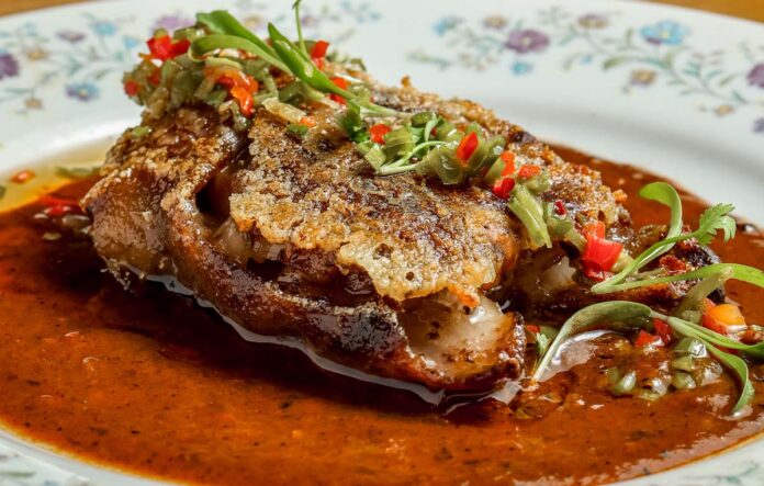 La lengua de novillo, por ejemplo, llega envuelta en hoja de plátano, horneada con paciencia, acompañada de un puré de habas que parece terciopelo y una salsa que recoge cada gota de su cocción, enriquecida con vino tinto y suero costeño. Es un plato que no busca impresionar: busca quedarse. A su lado, aparecen otras preparaciones que consolidan la identidad del restaurante: el gorrino crocante, las costillas de cerdo, el arroz de gallina y la pesca de río —un bagre deshuesado, relleno y envuelto en hoja de plátano— que sorprende por su textura cremosa y profundidad de sabor.