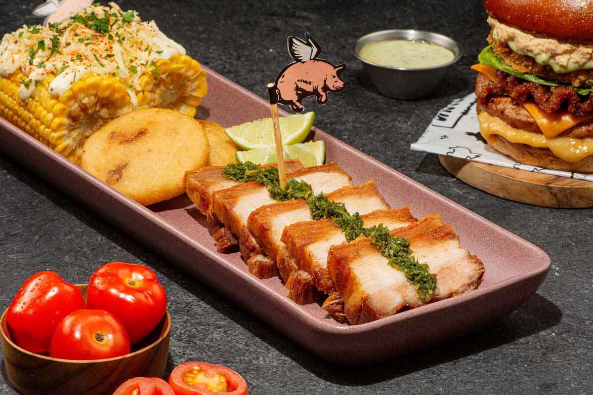 Y entonces aparecen las entradas, que aquí no son antesala sino parte esencial del relato. El Volcán de Nachos desborda, literalmente, mientras el ceviche de chicharrón juega con contrastes que sorprenden al paladar colombiano, acostumbrado pero no indiferente. Las Arepitas de Chicharrón y las Papas Pigasus llegan al centro de la mesa como una invitación a compartir, a ensuciarse las manos, a volver a ese ritual colectivo que define tantas comidas en el país.